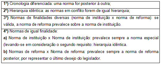 A lei de reforma, desde que válida (isto é, se estiver de acordo com a Constituição da República), tende a sempre prevalecer, se o conflito der-se entre normas de igual hierarquia. Isso não significa reproduzir a idéia sobre a qual repousa o critério cronológico. Explique-se. Se originariamente a Lei n. 8.213/91, que instituiu o regime geral de previdência social, conflitasse com o disposto no Estatuto da Criança e do Adolescente (Lei n. 8.069/90), esta deveria prevalecer, mesmo sendo anterior, por apresentar-se como norma especial em relação àquela, considerando a sua finalidade: regular os direitos do menor (titular).