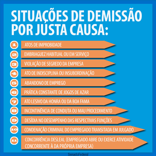A demissão por justa causa é um direito do empregador garantido pela Legislação brasileira. O artigo 482 da Consolidação das Leis do Trabalho (CLT) prevê 12 motivos de dispensa por justa causa. Acesse a Lei.